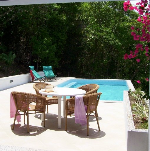 just more lounging space for reading, watching cable television, or writing postcards at the desk. The bedroom and the kitchen have ceiling fans but with the trade winds and gentle breeze you rarely need them. The private dining terrace is equipped with table and chairs and a lounge, a wonderful hideaway to hang out with a book or have a nap.